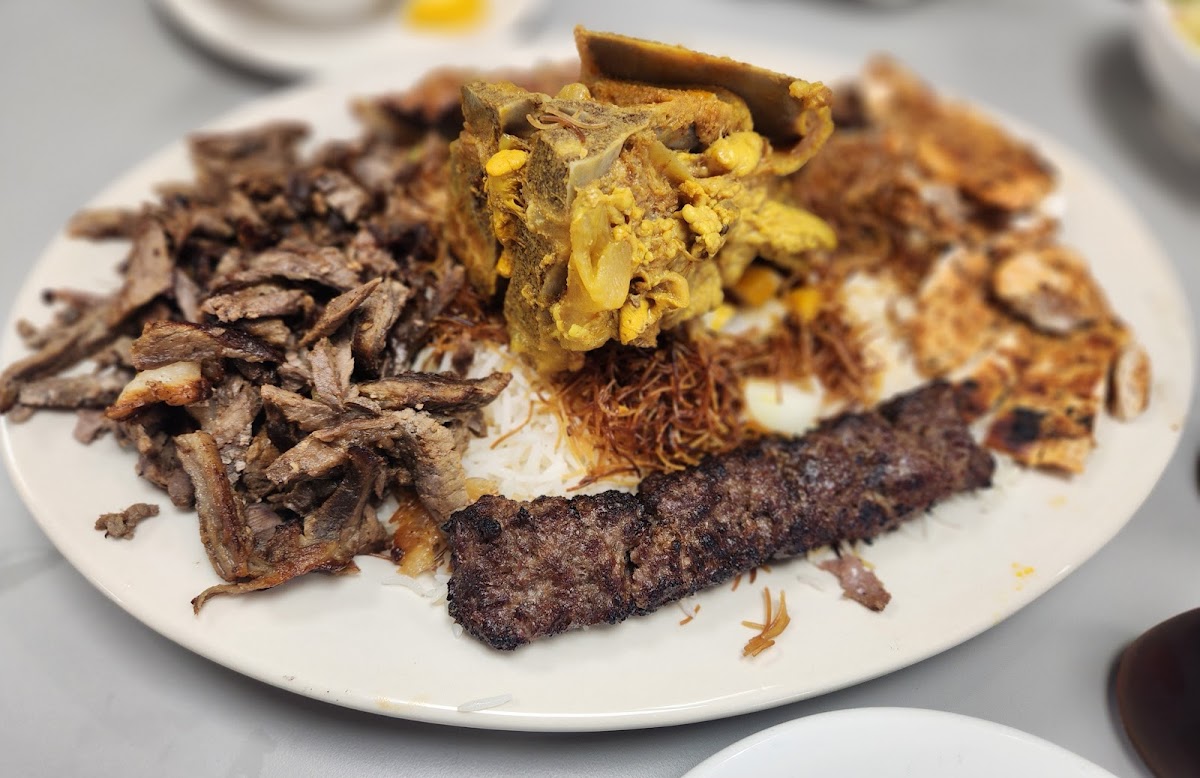 As we drove into the small parking lot beside Edulis Grill and opened the car doors, we were immediately greeted with the delicious smell of charred vegetables and meat. At this point, we were having a pretty late lunch and we could tell we were in for a treat. We walked in and found it to be relatively empty, with a total of 7 booths but only one occupied. After we sat down, Ali, the do-it-all man of the restaurant, told us that the menu was going to change soon and they were going to remove the baba ganoush and tabbouli along with some other adjustments. Originally we wanted to try the Bagila Bil Hihin, but they didn't have the fava beans ready since it was well past breakfast time. Instead we went with the other recommended breakfast item along with another Iraqi unique dish. As we were waiting for our food, we got some soup to start off Lentil Soup (Complimentary) - This was a nice warming soup with soft stewed lentils, spiced with a lot of cumin and served with two large wedges of lemon for you to squeeze in as wanted. Mahklama ($16.99) - This dish consisted of scrambled eggs mixed with kabob meat, parsley, tomato and onion. The flavor mainly consisted of cumin and turmeric. The texture was pretty soft and tender throughout. We found that it was perhaps a bit undersalted but still tasted good overall. Iraqi Shish Kabob ($21.99) - This included four skewers of pretty simple ground beef mixed with salt and other seasonings, then grilled to perfection and sprinkled with sumac. The exterior had a very nice crust that added texture and the interior was some of the most tender kabob we have ever eaten. The meat here was honestly absolutely amazing - better than any grilled kafta I've had at most Lebanese restaurants around the area. The taste was fantastic, a perfect mix of char, mellow beef, onion, and spices. They don't add parsley or mint, so there were no herbal notes. The kabob was served with onion and tomato that were perfectly charred on the grill. The onion had cooked enough from the heat that it only had a small raw bite, and the tomato was pretty softened from the heat. There were also some mini sliced cucumber, pickles, and a big bowl of rice pilaf (choice of rice or fries) to complete the meal. Each person also gets a samoon and an entire piece of Iraqi pita/Arabic bread/khubz to eat their main with. I think they buy these in the morning from a local bakery because they are served cold. If there was one improvement, it would be to warm up the bread a bit. At the end of the meal, they serve you a complimentary cup of a very nice black chai, filled with the fragrance and flavor of various spices (cardamom and cinnamon perhaps?). It's served unsweetened, but there is a container of sugar on the table to adjust to preference. By the time we left, the restaurant had completely filled up and the employees were pretty overwhelmed at that point trying to clear tables, bring out food, cash people out, and take phone orders. Only Ali was working the front and there were only two people cooking in the kitchen. Just be aware that this is a family establishment, so things might take longer than usual when the restaurant start filling up. Side Note: Edulis Grill serves each customer a bottle of water at no charge. Most other mom and pop Middle Eastern restaurants in the area charge for water. Overall Edulis Grill has some really great Iraqi food. I highly recommend the shish kabob. Give them a try. You won't be disappointed!